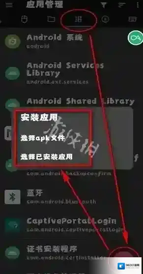 6、要给电视安装软件的话,就点击顶部的第五个选项(如下图所示),这个是电视应用管理栏目,然后点击右下角的“+”,选择要安装到电视是apk安装包进行安装即可。