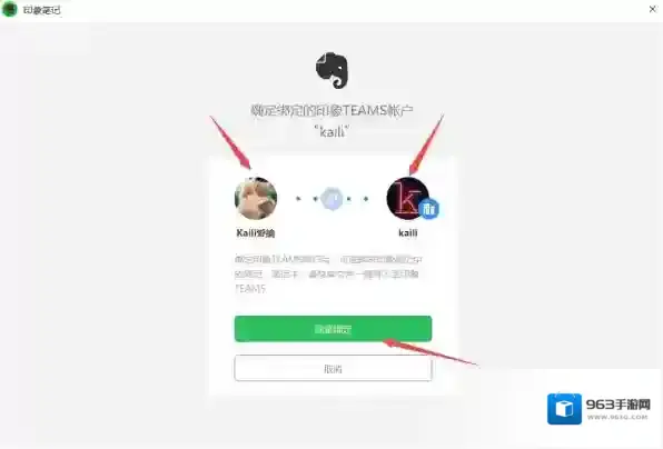 第五步,印象团队账号登录成功后,我们确认是自己的账号,然后点击同意绑定按钮,就可以轻松的将印象笔记账号与印象团队账号进行绑定了。
