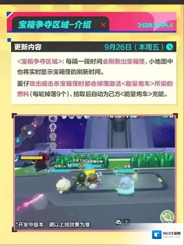 宝箱争夺区域则是蛋仔们获取能量炮车燃料的地方。每隔一段时间会刷新出宝箱怪,小地图中也将实时显示宝箱怪的刷新时间。蛋仔攻击或击杀宝箱怪时都会掉落激活能量炮车所需的燃料,拾取后自动为己方能量炮车充能。
