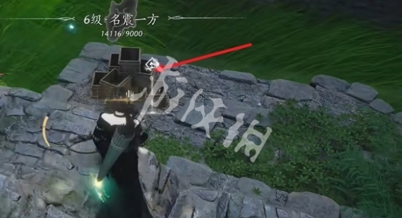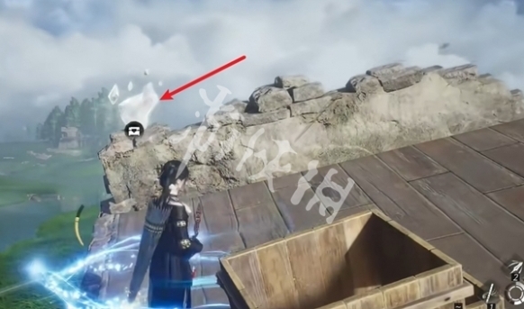 2、到达后,调整视角,即可看到木架子上面有个宝箱。