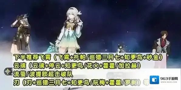 下半队伍推荐飞霄(飞霄+托帕/巡猎三月七+知更鸟+砂金)、云璃(云璃+停云+知更鸟/花火+藿藿/加拉赫)、流萤/波提欧超击破队、刃(刃+巡猎三月七+知更鸟/阮梅+藿藿/罗刹)等。