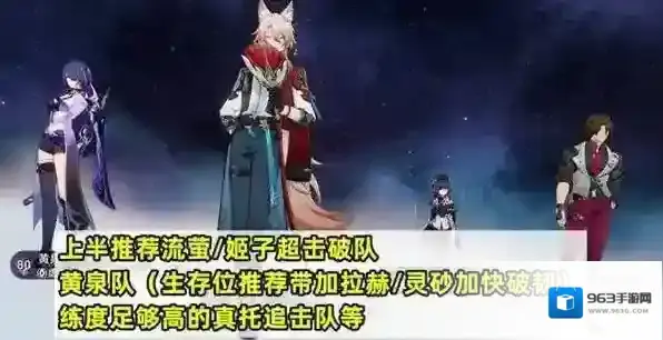 上半的话因为有剧目三兄弟,最推荐的自然是流萤,其次是姬子超击破队、黄泉队(生存位推荐带加拉赫/灵砂)、练度足够高的真托追击队等。