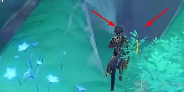 2、到达传送位置后,我们将视角拉到左侧花的位置,然后朝着花所在的方向跳下去,然后一直往前飞。