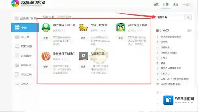 4、或者我们还可以在360极速浏览器扩展中心安装专门下载视频的插件,然后使用这些插件下载视频。安装方法如下: