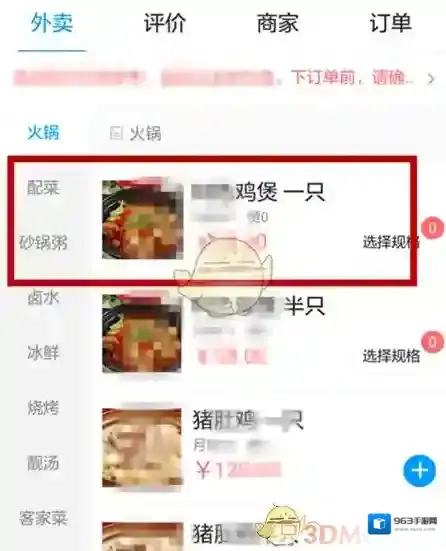 6.选择外卖的界面之后,在左边有一个列表是大分类:粥、砂锅粥、生鲜、烧烤等等。选择一个特色鸡煲一只。选择规格。