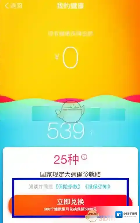 5.这个健康保障金额,从1个健康果开始兑换,最多到500,而对应的保额从10-5000,最大免费额度即可5000,限制为本人保障。