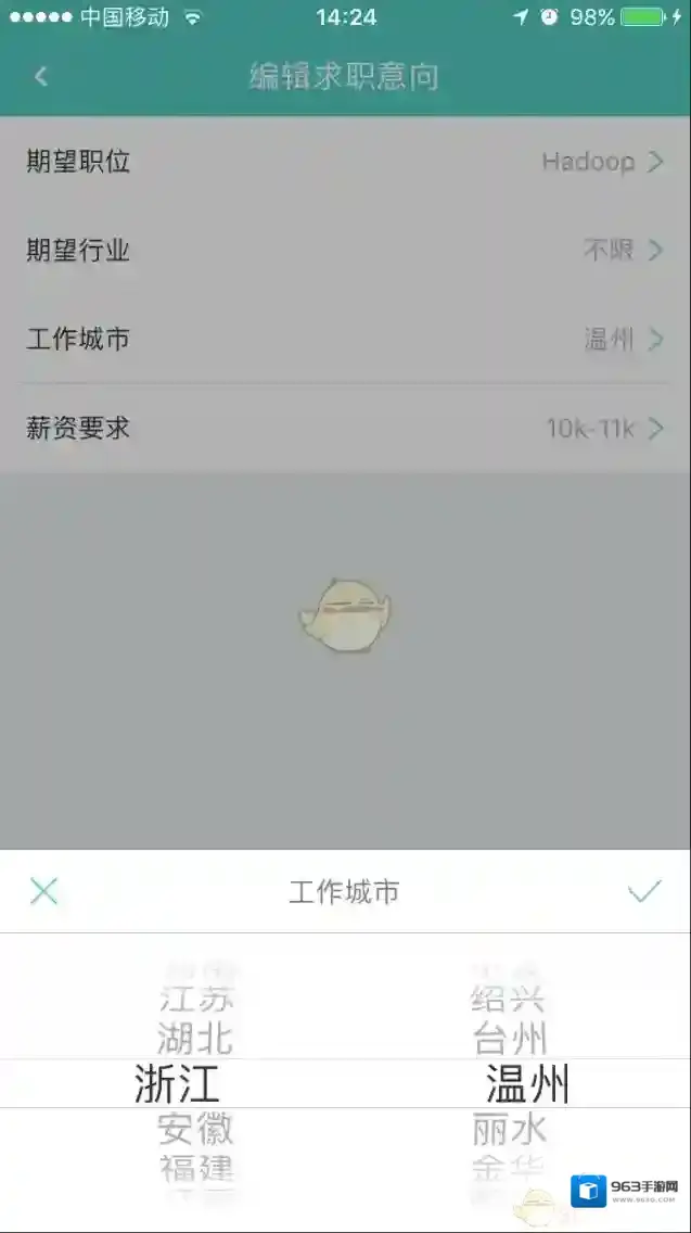 5、在“编辑求职意向”界面中,点击“工作城市”;