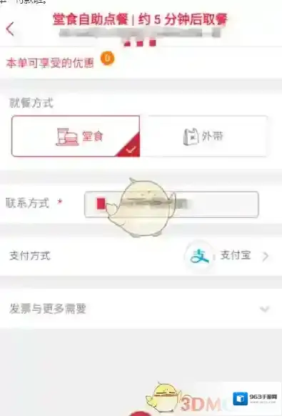6.在支付页面可选择“堂食”或“外带”。联系方式十分重要,支付成功后会有一条带有取餐好的短信到您的手机。还有支付方式及发票等选项。全部完成后就可以点击“提交订单”付款啦。