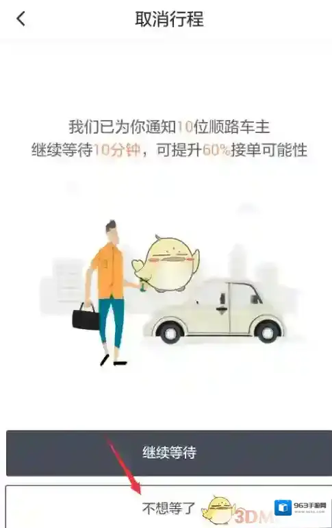 6、接着滴滴还会挽留你,告知已通知多少位顺路车主,想让你继续等待,可以直接点击“不想等了”按钮。