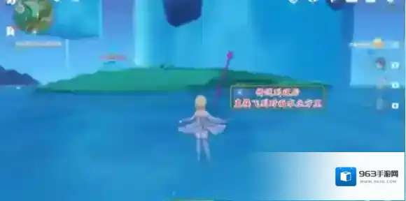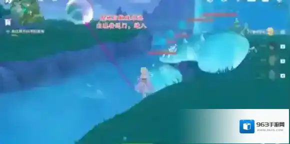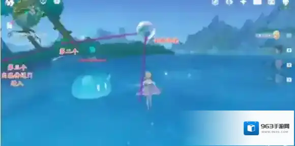 2、沿着石桥前往光标位置,对话结束后进入水立方,游到上面。