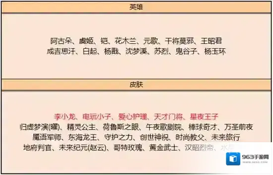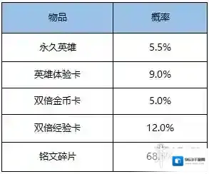 打开后可随机获得以下奖励之一:诸葛亮、兰陵王、伽罗、英雄体验卡3天、双倍金币卡:1日、双倍经验卡:1日、188/138/108铭文碎片。