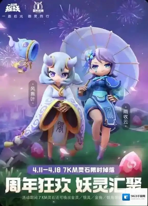 周年狂欢,妖灵汇聚!活动期间,击鼓限时掉落7KM灵石,周年庆期间唤醒有几率出现稀有妖灵哦!