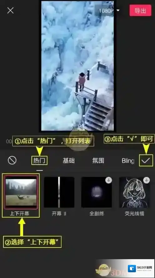 5、选择特效。点击“热门”,打开列表,选择“上下开幕”,点击列表右上角的“√”即可。
