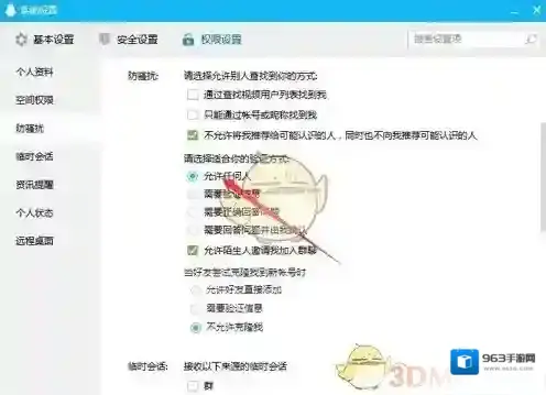 7、然后点击左侧“防骚扰”按钮,将验证方式切换为“允许任何人”就行了。