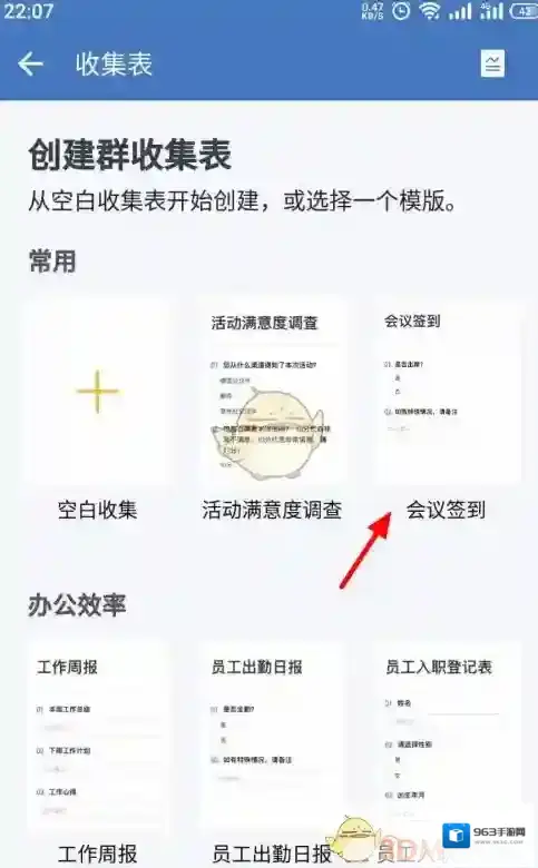 4、在创建群收集表页面,以会议签到为例,点击“会议签到”;