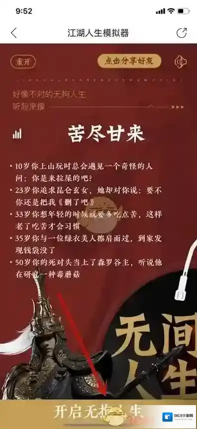 2、开启新人生之后,然后我们一直点击屏幕,在点击下面的人生总结。