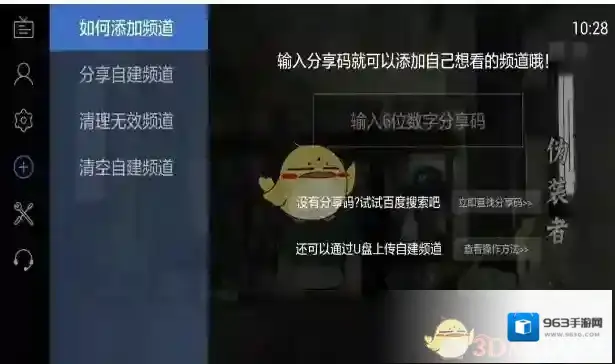6、在这里可以添加自建频道,输入六位分享码,即可再建自建频道,让自建频道活起来,永远跟着你走,随时可添加。