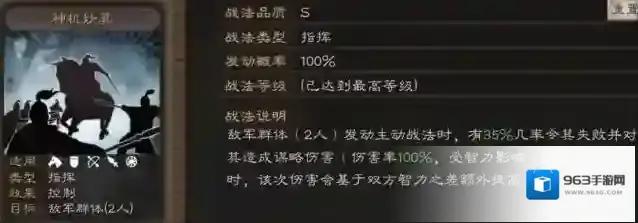 指挥战法神机妙算:敌军2人发动主动战法时,有几率失败并对其造成谋略伤害。自身为主将时,伤害会基于智力属性差额外提高。