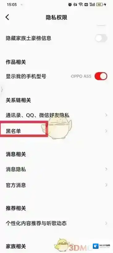 3、进入到隐私权限的页面之后往上滑动找到黑名单点击;
