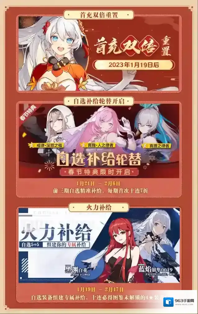 1月12日起,《崩坏3》将开启2个新春登录福利活动,舰长登录游戏总计可获得扩充补给卡×10、精准补给卡×10、「新年自选S女武神宝箱·2023」×1、水晶×288,还有「未泯之心绶带」、星石奖励!获取「新年自选S女武神宝箱·2023」后,舰长可在指定的17个角色、「重构模具·专攻自选箱-TypeB」×1、「远古传承」×200中任选其一!