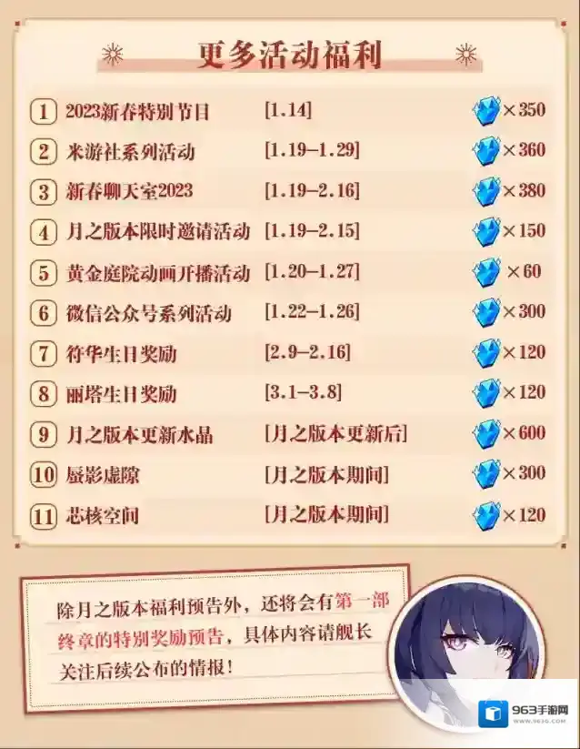 除月之版本福利预告外,还有第一部终章的特别奖励预告,具体内容舰长可点击查看~