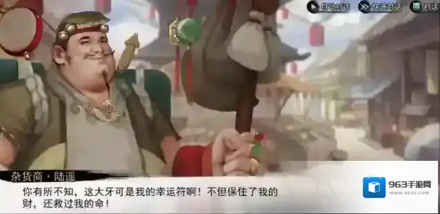 自从捡到大牙之后,陆遥便一直揣在身上,运气也随之变好。大牙不小心滚落时,陆遥找到了罕见的宝物;后遇劫匪袭击,被一镖穿心,也正好打在了大牙上,最后陆遥靠着装死捡回了一条命。