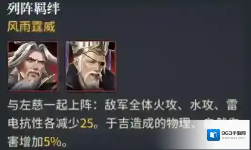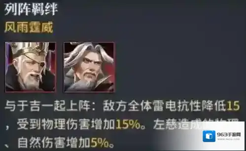 首先张角与张宝张梁的两个列阵羁绊都可以使得重要状态「离间」在敌军中持续存在,保证了张角的群体增伤被动可以被不断的触发,其次多个羁绊效果可以大量减少敌军的雷电抗性,使得我军多名武将的雷电伤害技能可以造成巨额伤害,而刘表的存在不仅是作为坦克,他强大的列阵羁绊可以清除我军受到的控制效果,为我军的极致输出提供了保障,左慈跟于吉的主动技能同时具有强力增伤跟眩晕控制效果,最终构建出可以快速清屏的雷法阵容。