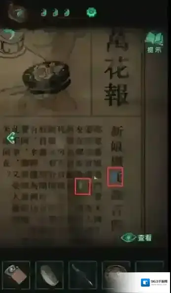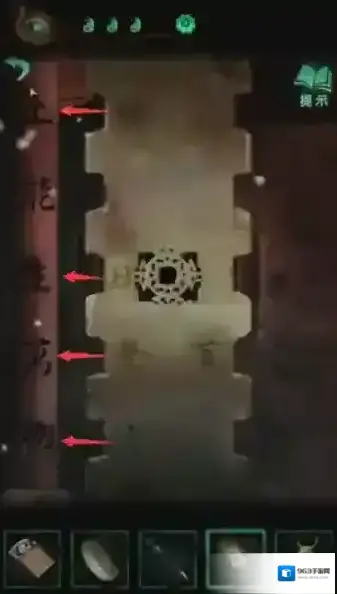 32、来到大门,使用序号29获得到的物品,在门口对联两处进行对照。发现线索。