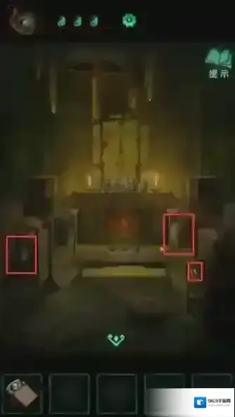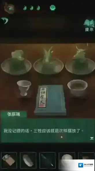 54、将梳子放在盆沿,铃铛挂在左边架子上,鼓放右架子上。然后点击中间红光处。