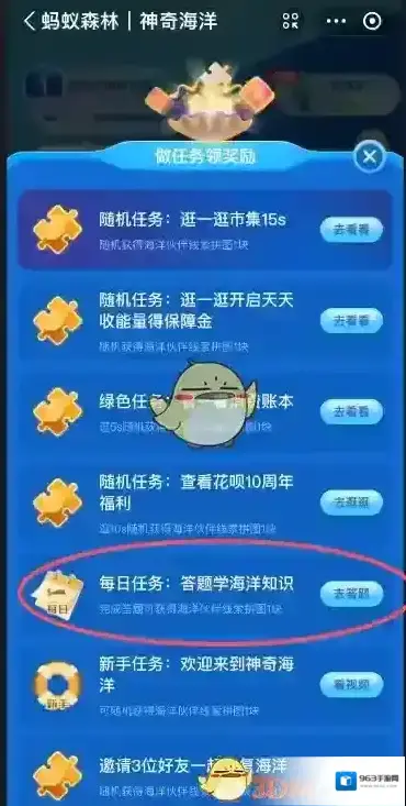 2、找到每日任务-答题学海洋知识,点击去答题