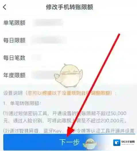 6、进入修改手机转账限额的页面后,输入修改金额,点击下一步