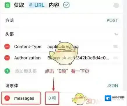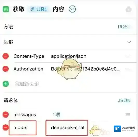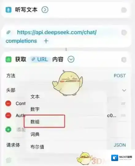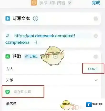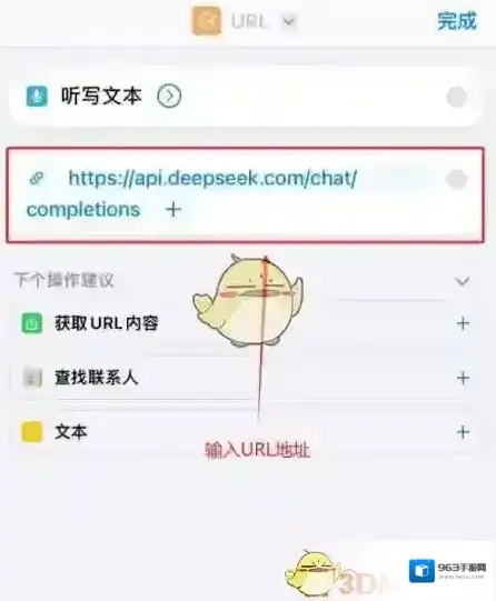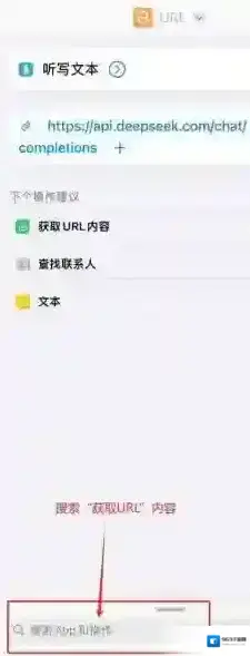 4、搜索并添加“URL”,填入https://api.deepseek.com/chat/completions(注意更改符号)。