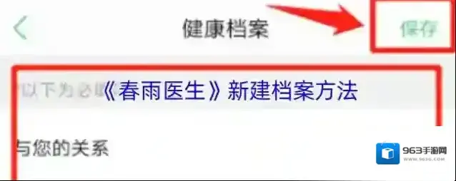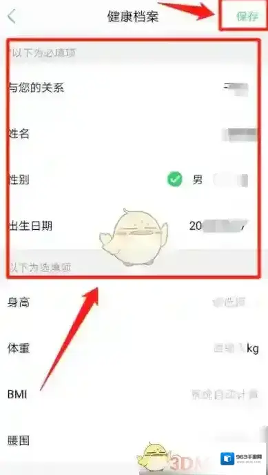 4、在“健康档案”窗口中,输入档相关信息(包括姓名、性别、出生年月),最后点击右上方“保存”按钮即可春雨医生新建档案。