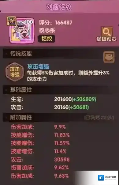 粉色核心铭纹:刘备-特有属性为伤害加成,铭纹技能是每获得5%伤害加成时,额外增加3%的攻击力,能跟本身铭纹特有属性加成配合,又适配诸葛亮铭纹的伤害加成。同时大量的伤害加成和攻击力提升又能全面覆盖到关羽的普攻追击和大招的双重输出手段,跟关羽适配性极高。