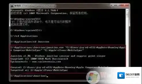 6、在命令行输入命令:junction.exe”C:Users用户名AppDataRoamingApple ComputerMobileSync” “G:AppleiTunesMobileSync”,按回车。其中第一个参数是您的iTunes备份路径(如前文所述),第二个参数就是要更换的备份路径了。注意“用户名”需要更换成自己计算机的用户名哦。