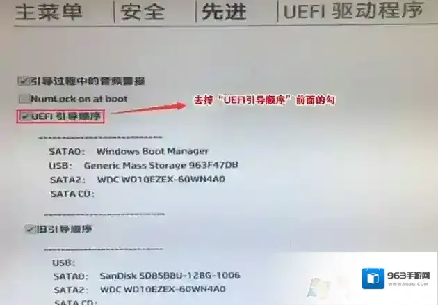 6、进入后将UEFI顺序前面的勾去掉,让机器默认为传统启动,这样方便安装WIN7,如下图所示;