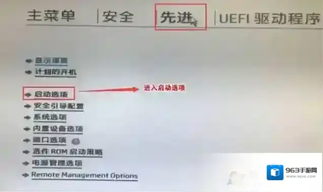 5、F10保存重启后再次开机按ESC,然后选择F10进入BIOS设置,将鼠标移动“先进”选项中,选择”启动选项”后回车进入,如下图所示: