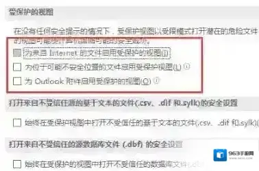 4、接着在可以看到:没有任何安全提示的情况下,受保护视图以受限模式打开潜在的危险文件。有助于最小化对计算机的损害。禁用受保护的视图可能使计算机面临可能的安全威协。将:为来自Internet的文件启用受保护的视图、为位于可能不安全位置的文件启用受保护视图、为Outlook附件启用受保护的视图三个选项的勾去掉,点击确定保存设置。