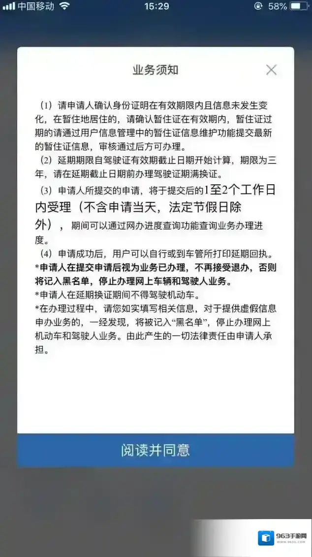 3、阅读并同意业务须知即可进行办理延期换领驾驶证。