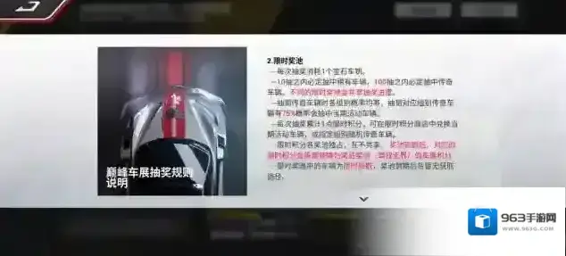 在抽到传奇车辆时,极限组、性能组、运动组的概率是均等的,抽到对应组别传奇车辆有75%的概率会抽中当期活动车辆。