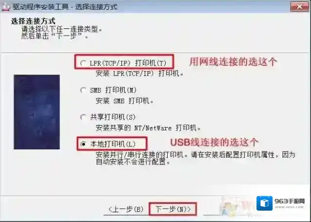 3、选择打印机的方式,用USB线连接的选“本地打印机”,然后点下一步①、网线连接的选第一个“LPR”,然后点下一步会自动在网络上搜索打印机并安装驱动,相对简单这里不作过多介绍②、USB线连接的选“本地打印机”,今天要说的就是这个,选好后点下一步