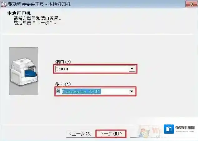 4、选择好端口及型号后点下一步端口:打印机是用USB线连接的,所以选择“USB00x”端口(USB00x代表USB空白端口,以实际为准)型号:选择“DocuCentre S2011”,如果下拉框型号列表为空,是因为驱动程序位数与系统位数不相符,重新下载相应的驱动即可