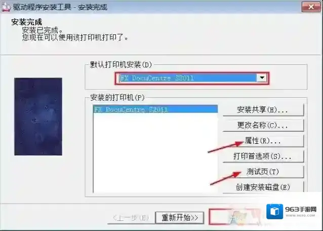 7、安装完成在这个界面中我们可以将富士施乐 DocuCentre S2011设为默认打印机,可以点击打印测试页,还可以查看打印机属性,最后点击完成