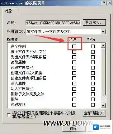 5、输入完成后点击确定会出现权限选项,我们直接勾选完全控制。确定即可