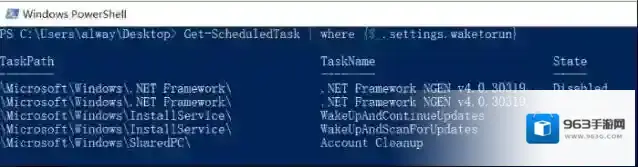 三、禁止软件唤醒设备而且有些人把所有会唤醒电脑的设备全部都禁止了,有时候还是会被唤醒,可以用这个命令。Get-ScheduledTask | where {$_.settings.waketorun} 注意这个命令需要使用Windows Powershell来执行:1、鼠标右键点击屏幕左下角的Windows图标,就是开始按钮,然后列表里面又Windows PowerShell(l) 和Windows PowerShell(管理员)(A)选择带管理员的窗口。2、或者到桌面按住Shift建右键点击桌面空白处,右键菜单就会多一项在此处打开PowerShell窗口 点击这个,会出来一个蓝色的命令窗口。