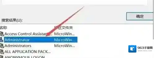 6、在下面的搜索结果中点击当前账户,或是直接点击超级管理员账户;(如果你不使用Administrator账户登录,那么找到你的登录用户名添加一样的(或者EveryOne)。)