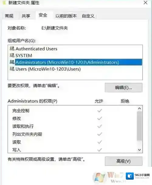 7、回到文件夹的属性窗口中,就可以看到选择的管理员账户已添加好了,大家还可以点击编辑把权限设置为完全控制。