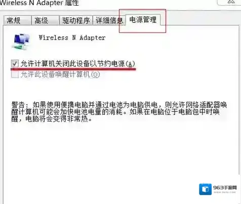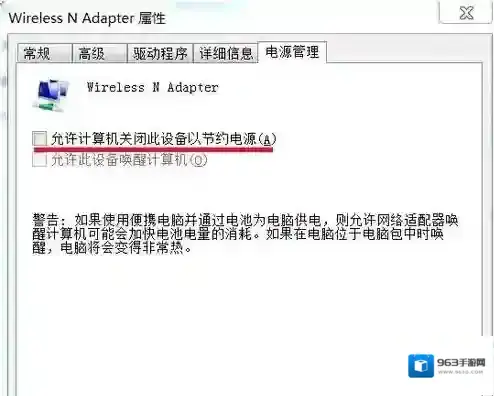 4、我们在弹出的:Wireless N Adapter 属性窗口,单击:电源管理;m.winwin7.com