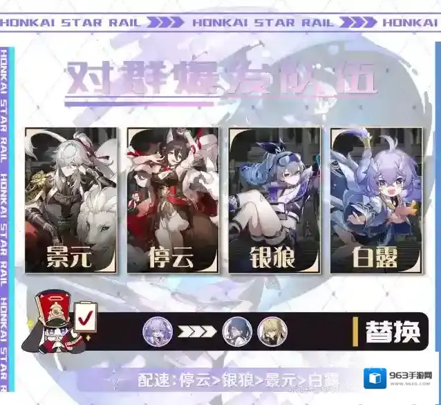 停云技能为景元增幅-银狼技能施加负面效果-景元输出并为神君叠层-奶位给奶或普攻-停云银狼普攻补输出-神君输出