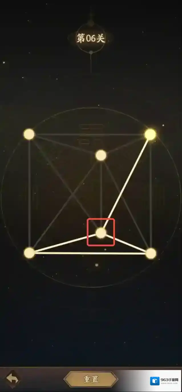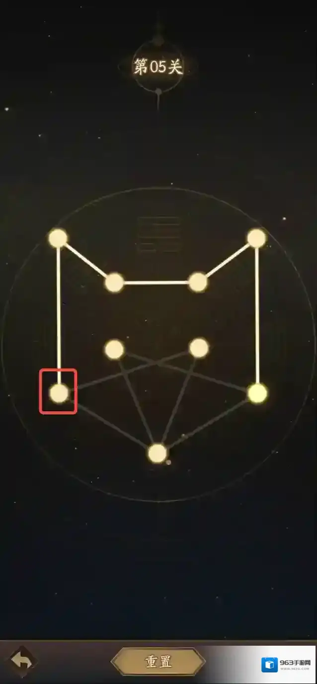 第五关选择图示奇数端点起手,先把外圈连接,随后依次连接其余三点即可通关。